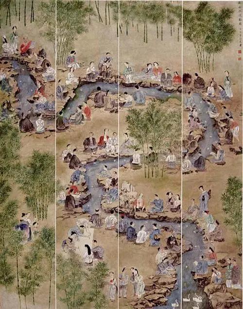 這是《論語(yǔ)》中關(guān)于上巳節(jié)的描寫。草長(zhǎng)鶯飛,眾人嬉戲,一副春和景明的光景。