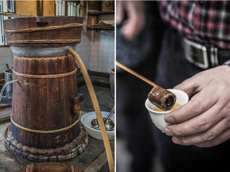 釀酒師傅24小時守候在酒缸邊,觀察著發(fā)酵的進展,把握著開耙的節(jié)奏,期待開春收獲一壇壇玉液瓊漿。