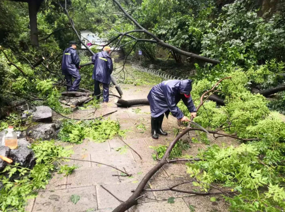 蕺山書院多處地方出現折樹和落葉遍地的情況,景區(qū)工作人員迅速展開善后清理工作。景區(qū)工作人員迅速清理被臺風刮落的樹枝和落葉,疏通道路,消除潛在安全隱患。