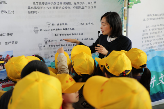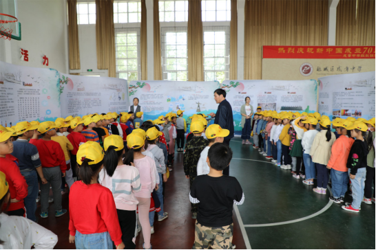 在展覽區(qū),同學(xué)們觀展、思考,收獲了不少與大禹以及“五水共治”相關(guān)的知識(shí);在多媒體教室中,大禹陵景區(qū)講解員還為大家?guī)?lái)了生動(dòng)的一堂課——《纘禹之緒,追禹之跡》。