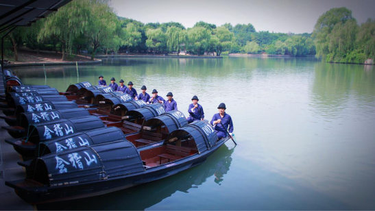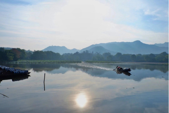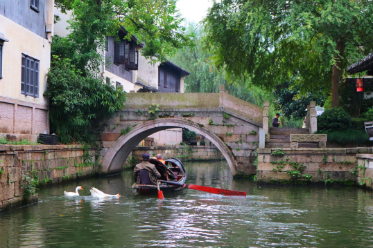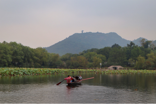 烏篷由荷池穿行而過(guò),遠(yuǎn)山帶朝暉,天際接秋水。沿著北面水道,小船徐徐駛?cè)肭宄康墓糯迳钐?,?zhēng)渡,爭(zhēng)渡驚起一雙憨態(tài)可掬的水中白鵝,叫人頻頻回眸。