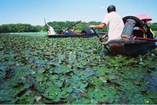 南鎮(zhèn)紅菱池中,早已有大片大片的菱葉一圈圈地鋪開(kāi), 映綠了半片池水。乘坐烏篷緩緩進(jìn)入其中,便可看到?jīng)]于葉下的顆顆紅菱,嬌羞可人。掬一把稽山水,采一捧鮮紅菱,收獲的就是那“天涼好個(gè)秋”了。