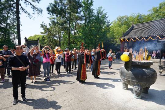 “民祭大禹”儀式為大禹陵景區(qū)最具特色的文化表演。通過祭祀禹王,展現(xiàn)延續(xù)千年的中華禮儀,彰顯非遺文化之美,表達(dá)華夏兒女對立國始祖的追懷之情。端午期間,享殿每日呈現(xiàn)六場極具體驗感、互動感的祭禹表演,游客可身著古服參與其中,在司儀主持下敬酒、敬香、祈福,感受古老文化的魅力。