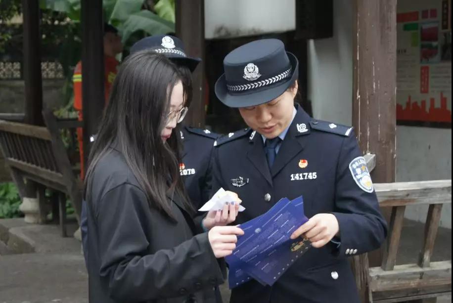 區(qū)公安分局警花在景區(qū)內(nèi)耐心地為游客普及防電信詐騙的知識(shí),提高人們防騙意識(shí)。