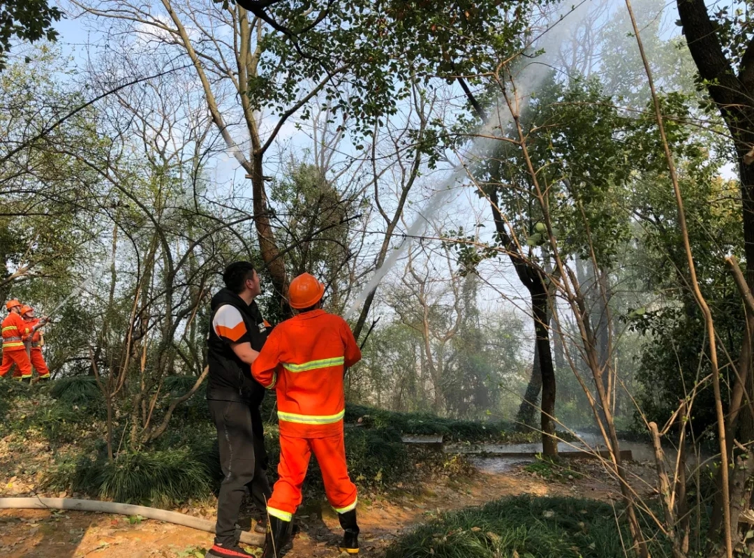 對(duì)周圍樹木進(jìn)行澆濕,從火源邊緣向中心點(diǎn)滅火,防止火情蔓延,最大限度的減少火災(zāi)損失。