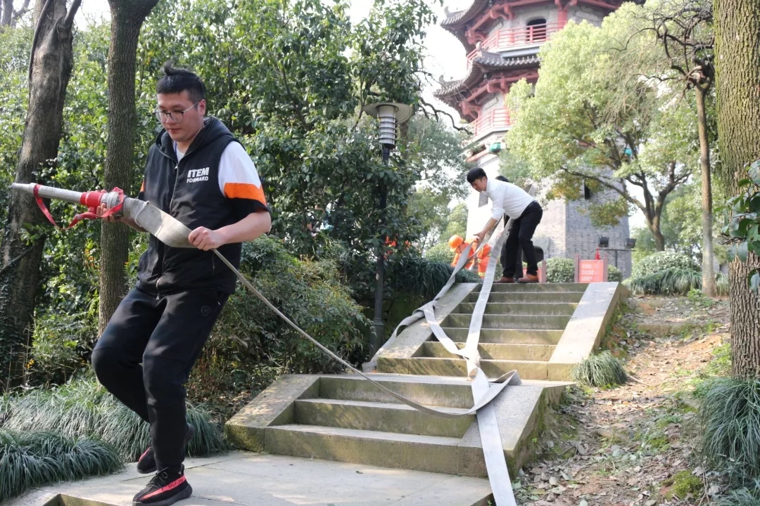滅火組成員分別趕到文筆塔附近消防栓的各個(gè)位置上,打開消防栓蓋,連接好水帶槍頭迅速奔赴火災(zāi)現(xiàn)場。