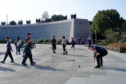 廣場(chǎng)上的另一塊地方,小朋友們的歡笑聲此起彼伏,打陀螺,滾鐵環(huán)……好不熱鬧。大朋友們?cè)谂赃呉植蛔⊥?,也玩在一起?/span>
