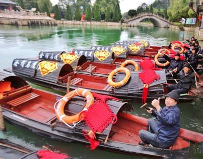 禹池生春色,烏篷載福來(lái)。南鎮(zhèn)烏篷船,早已掛上中國(guó)結(jié)、貼上福字。游客朋友們乘坐烏篷之后,還可憑烏篷船票領(lǐng)取發(fā)財(cái)樹(shù)上的紅包,美滋滋!