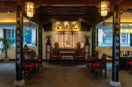 走進(jìn)酒店大堂,第一個(gè)映入眼簾的就是正上方懸掛的“思遠(yuǎn)堂”大匾。前后兩側(cè)對(duì)聯(lián)分別為“虛能引和靜能生悟,仰以察古俯以觀今”和“持其志勿暴其氣,敏於事而慎於言”。再現(xiàn)了古城臺(tái)門(mén)人家的廳堂風(fēng)貌和文化氛圍。