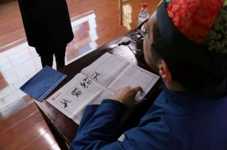 既然來到書法圣地紹興,怎能不學習寫大字呢?在私塾先生的指導下,代表團一行人手握毛筆,橫平豎直地寫著中國漢字。一位代表團成員更是學著手機上的漢字,有模有樣地“畫”下了“我愛紹興”這幾個大字。