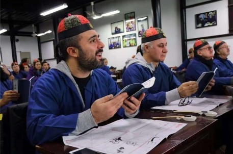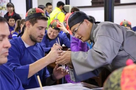 私塾課堂上,代表團一行人在工作人員的幫助下穿上長衫,帶上瓜皮帽,跟著私塾先生搖頭晃腦地念著《三字經》:“人之初,性本善……”雖然中文很拗口,但是大家都學得津津有味。