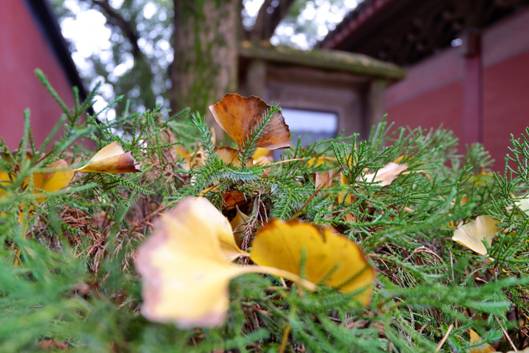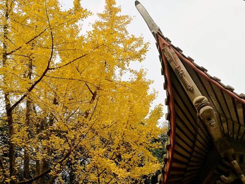 霜降過后,景區(qū)內(nèi)一棵棵銀杏樹漸漸被秋意染成了金黃。微風(fēng)拂過時(shí),銀杏葉如成群的蝴蝶隨風(fēng)而舞,飄落一地,鋪成一層松軟的金色地毯。