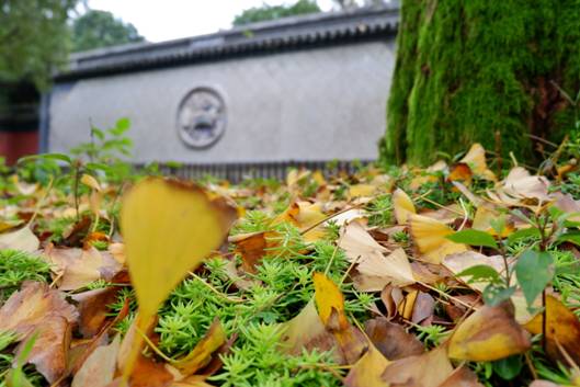 古老的銀杏與紅墻灰瓦、飛檐翹角和諧地融為一體,將秋色與歲月凝成了一幅圖畫。