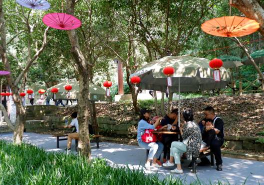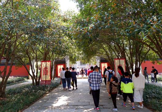 桂花成串成串開滿了枝椏,一樹一樹競相開放,整個景區(qū)都被濃郁的桂花香籠罩。在濕潤的空氣中,行走其中,每一絲呼吸也有淡淡的香氣作伴。