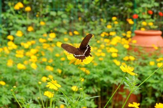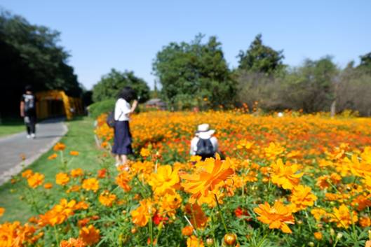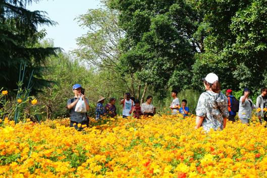花卉園里花開正好,硫華菊那紅、黃色的花朵大片大片地鋪開于翠綠的草地上,蝴蝶、蜜蜂,先游客一步在此久久流