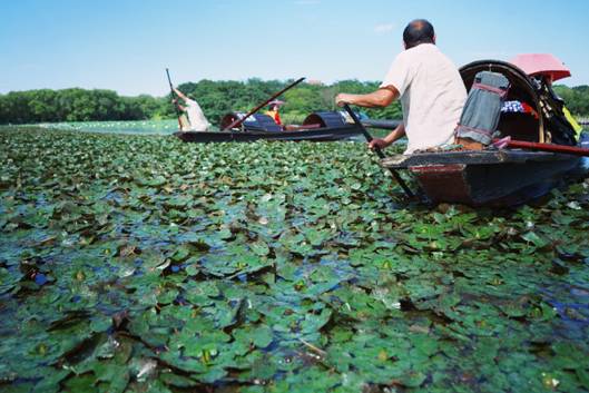 每日一早,采菱人都會(huì)采摘滿滿一船的新鮮紅菱,送給乘船游客品嘗。