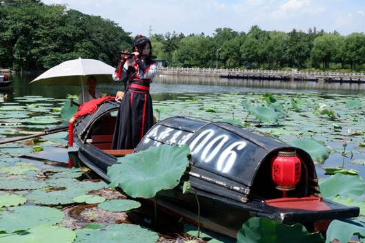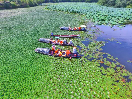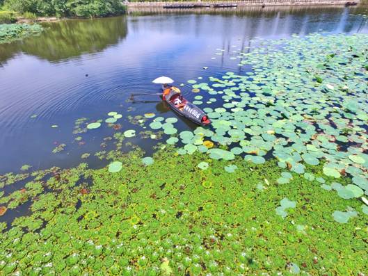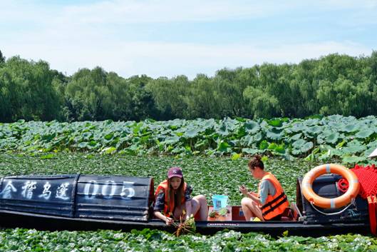 烏篷緩緩進(jìn)入碧荷深處,在這里,“烏篷船風(fēng)情月”的另一位主角——紅菱,登場(chǎng)了。紅菱沒(méi)于翠葉之下,嬌羞可人。網(wǎng)紅達(dá)人紛紛掏出自己的數(shù)碼裝備,將采摘紅菱的樂(lè)趣通過(guò)直播傳達(dá)給粉絲們。