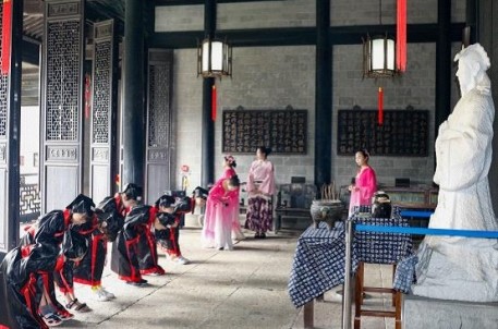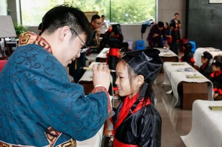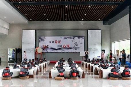 9月10日上午,在蘭亭書法博物館,50名一年級(jí)新生身著漢服,在悠揚(yáng)的編鐘古樂聲中,迎來了他們求學(xué)生涯中第一場盛大的開筆禮儀式。整場開筆禮分為正衣冠、凈手靜心、朱砂啟智、擊鼓鳴志、啟蒙立人、誦讀經(jīng)典、師長寄語、敬香朝圣和曲水流觴共9項(xiàng)流程。