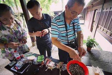不少游客在享殿領(lǐng)取了菖蒲,帶回家掛在門(mén)前。