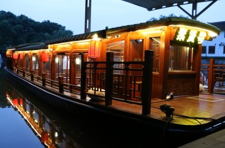 “聚賢號(hào)”和“會(huì)稽號(hào)”是水城公司全新打造的兩艘富有濃郁水鄉(xiāng)特色的豪華畫(huà)舫。這兩艘新船外型、內(nèi)部構(gòu)造和機(jī)器配置一模一樣,金色鋁瓦裝飾的船頂,木包鋼技術(shù),擁有靚麗的菠蘿格紅木材質(zhì)“外型”和堅(jiān)硬的鋼制“內(nèi)臟”。船艙內(nèi)部配套設(shè)施齊備,紅木桌椅,液晶電視、卡拉OK點(diǎn)歌器一應(yīng)俱全,還設(shè)有獨(dú)立衛(wèi)生間和開(kāi)水間,適用于各類政務(wù)接待、商務(wù)活動(dòng)和私人定制服務(wù),相當(dāng)美觀大氣。