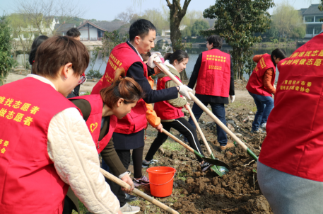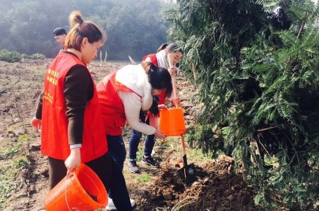 植樹過程中,大家個個熱情高漲、干勁十足,三五人一組,分工合作,配合默契,有的挖坑、有的扶樹、有的培土、有的澆水,每道工序有條不紊,到處一片熱火朝天的勞動場景,時不時地,還能聽到在山間回蕩著的歡聲笑語。眾人拾柴火焰高,經(jīng)過大家一上午的奮戰(zhàn),新栽種的綠化苗木在山坡上構(gòu)成一道靚麗的風(fēng)景線,大家還紛紛和自己親手栽種的樹苗合影留念。最后,大家集體合影留念,組員們手中高舉勞動工具,歡呼雀躍。