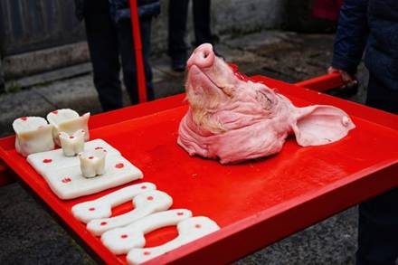 上午九時十八分,百余名大禹后裔從守陵村出發(fā),扛著朱紅托架,上置三牲(牛頭、羊頭、豬頭)福禮、三茶六酒、春糧、水果、花籃,手舉姒族祭禹旗幟,敲鑼打鼓浩浩蕩蕩前往禹廟大殿祭祀先祖。