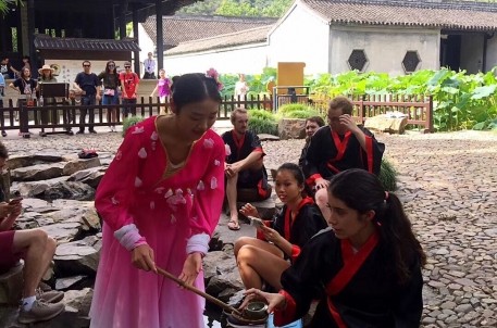 2002年,“塔夫茨在中國”項目開始運(yùn)行。每年秋季,美國塔夫茨大學(xué)都會派出喜歡中國文化的學(xué)生到紹興進(jìn)行為期數(shù)日的游學(xué)旅行,紹興蘭亭是他們每次游學(xué)的其中一站。在這里,他們認(rèn)真聆聽書法家喻革良講述《有趣的漢字與奇妙的書法》,講漢字的起源及演變過程,講“天下第一行書”《蘭亭集序》的故事,同學(xué)們還握筆感受了書寫的樂趣。在曲水流觴景點,同學(xué)們穿著中國漢服載歌載舞,并用簡單的中文學(xué)著作詩,演繹千百年前的文人雅事。