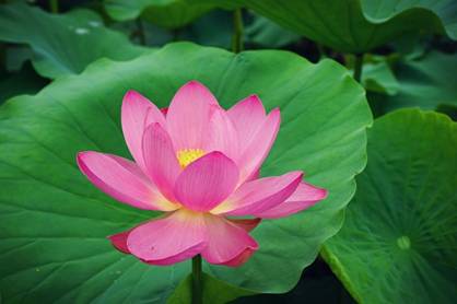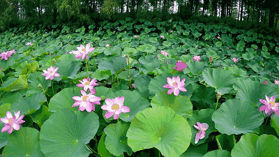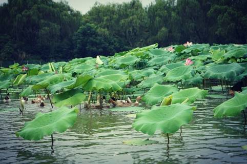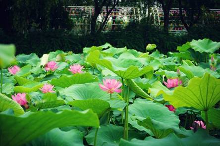 放眼望去,密密麻麻的荷葉鋪在水面上,綠意盎然。有的含苞待放,有的張開了三四片花瓣,有的全部盛開了,如一位位亭亭玉立的少女。