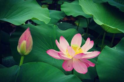花色由淺粉向著純白漸變,嫩黃的花蕊藏在當(dāng)中孕育著蓮子。