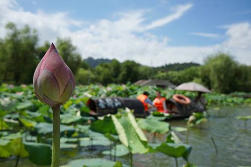 乘著會稽烏篷,翠綠的蓮葉隨著微風(fēng)涌動,將絲絲暑氣消散,令人身心舒暢。淡淡的荷花清香,仿佛一切的浮躁與不安在這一刻都被沉淀。