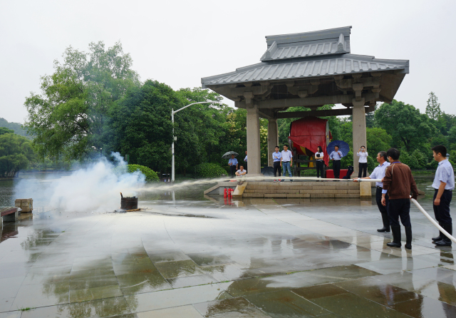 在完成以上演練科目后,根據(jù)情景預(yù)設(shè),景區(qū)員工發(fā)現(xiàn)火災(zāi)險(xiǎn)情,立即向景區(qū)安全負(fù)責(zé)人報(bào)告,馬上啟動消防應(yīng)急預(yù)案,景區(qū)志愿消防隊(duì)迅速進(jìn)入狀態(tài),按照分工及應(yīng)急處置步驟,進(jìn)行緊急處置火災(zāi),整個(gè)操作流程迅捷有效。
