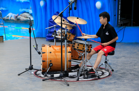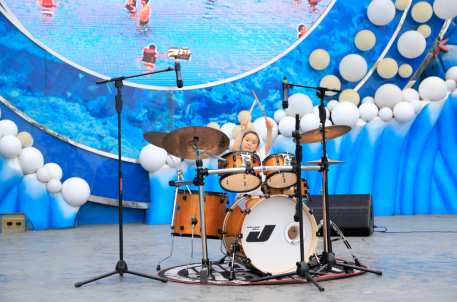 2017年6月4日下午,紹興鏡湖樂(lè)園夢(mèng)幻水世界愛(ài)情風(fēng)暴潮舞臺(tái)表演區(qū)舉辦了2017職協(xié)杯鼓手大賽星星賽匯報(bào)演出。本次演出由中國(guó)頂級(jí)鼓手賽事締造者中國(guó)職業(yè)樂(lè)手協(xié)會(huì)與全國(guó)教育中心、職協(xié)浙江中心聯(lián)合主辦,各打擊樂(lè)琴行等樂(lè)器教育機(jī)構(gòu)聯(lián)合承辦。演出形式為單人輪流演奏指定曲目與自選曲目(可不選),指定曲目為counting star。表演者均為3至24歲的青少年,且有家長(zhǎng)與指導(dǎo)教師陪伴。有的小朋友表現(xiàn)出了豐富的舞臺(tái)經(jīng)驗(yàn),強(qiáng)節(jié)奏感的律動(dòng)灑脫自然;而有的小朋友明顯表現(xiàn)緊張,缺乏表演經(jīng)驗(yàn)積累。匯報(bào)演出過(guò)程中穿插兩場(chǎng)表演,一是女生吉他自彈自唱《南山南》,一是幼兒舞蹈《荷塘月色》。