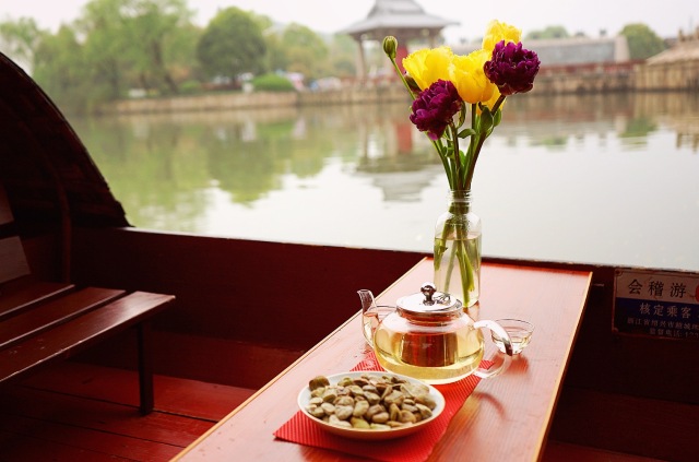 劃過河面蕩起漣漪,穿越在古橋與時空之間。我們還準(zhǔn)備了具有紹興特色的下午茶套餐,一邊品嘗、一邊談笑欣賞沿途風(fēng)景,看陽光照耀下水波蕩漾的河流,別有一番滋味。