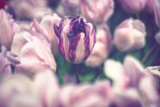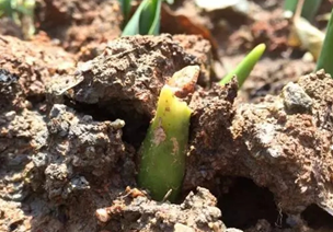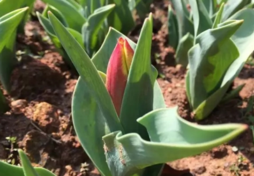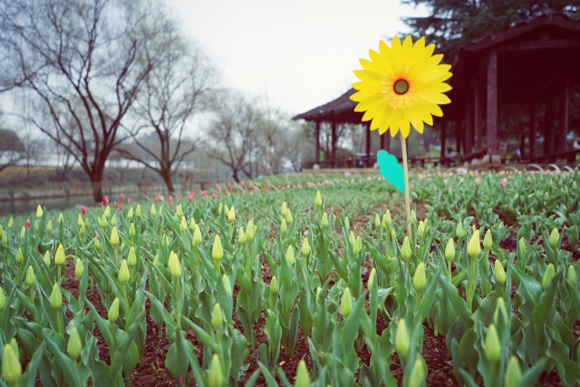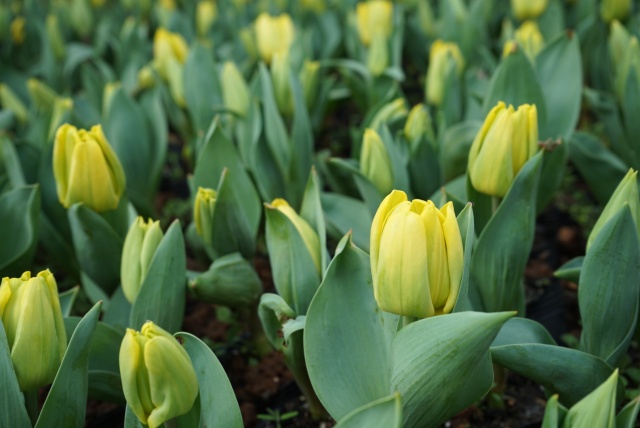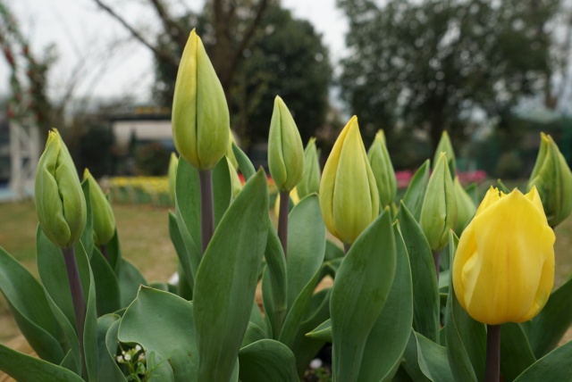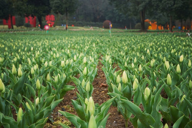 目前花田里早期的郁金香,在春日暖陽的照耀下都有了芬芳前的雛形,含苞待放。