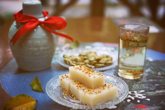 聞香猜謎 游客朋友們可在景區(qū)桂花林下小憩,聞著甜甜的桂花香,品桂花茶、黃酒、茴香豆等紹興特色食品。