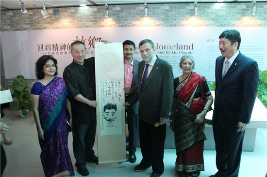 座談會后,雙方代表參觀了正在紹興魯迅紀念館展出的“回到精神的故鄉(xiāng)”——劉春杰魯迅視界作品展”,中國當代版畫藝術家劉春杰先生將自己在昨晚連夜創(chuàng)作的一副魯迅肖像水墨畫贈送給了參加大師對話的泰戈爾后代。