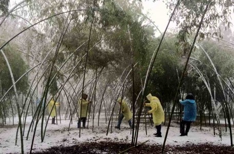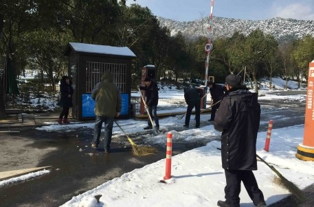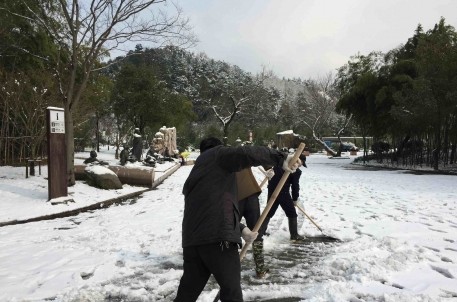 考慮到游客的出行安全,蘭亭景區(qū)于1月22日-23日期間暫停營業(yè)。這段期間,也是此次寒潮降雪量最大的時(shí)期,于是,蘭亭景區(qū)每天組織值班人員和保安對景區(qū)的主要道路進(jìn)行清掃,清理被大雪壓斷的樹枝、毛竹,并用長竹竿敲打雪松、樟樹等常綠樹木容易掛雪的樹上積雪。確保景區(qū)在正常開園后,游客能有一條可以正常行走的道路。