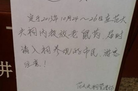 紹興市偏門直街169號(hào)范大夫祠于2013年10.24~10.26日在祠內(nèi)投放老鼠藥,其目的是為了除去祠內(nèi)的蟲、蟻、老鼠……等等,使祠內(nèi)更加整潔、衛(wèi)生,同時(shí)給參觀者一個(gè)好的環(huán)境。來(lái)到范大夫祠,了解范蠡生平為越王勾踐復(fù)國(guó)及帶領(lǐng)百姓做大量實(shí)業(yè)的經(jīng)歷以及68歲辭官經(jīng)商致富的經(jīng)驗(yàn),定會(huì)讓你們受益匪淺。近日,也剛好是財(cái)神范大夫的生日,來(lái)祠內(nèi)看范蠡的游客會(huì)很多,在參拜、進(jìn)香的過(guò)程中我們應(yīng)注意小心用火,以免造成不必要的損失,尤其是小孩子、老年朋友們應(yīng)多加注意。來(lái)到這里,我們永遠(yuǎn)提倡快樂(lè)的來(lái),安全的回!