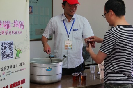 夏日炎炎,為緩解暑熱,東湖景區(qū)特別在游客中心為每一位到達(dá)景區(qū)的游客推出免費(fèi)提供解暑干菜湯贈(zèng)飲的服務(wù),充滿愛(ài)心和人情味的活動(dòng)受到了游客的一致好評(píng)。