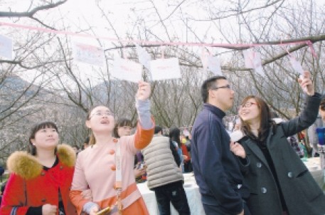 櫻花林遇君門邊,由團(tuán)市委、市旅游集團(tuán)主辦的“櫻為愛情 攜手今生”活動(dòng)在這里舉行,數(shù)百名男女青年徜徉在櫻花下,渴望遇見那個(gè)他(她)。許多小卡片和紅氣球飄揚(yáng)在櫻花林中??ㄆ蠈懼彰?、職業(yè)、年齡、愛好等,以便互相交流。