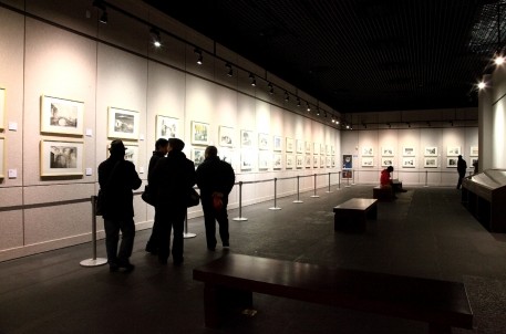 2012年12月29日,寒風(fēng)凜冽,雨雪如磐,這是紹興今年入冬以來的第一場(chǎng)雪。紹興博物館越王城館正大門,豎立著大幅的藍(lán)色宣傳海報(bào),海報(bào)注寫:橋·楊明義百橋圖展。上午是一個(gè)簡(jiǎn)短而隆重的開幕式,市領(lǐng)導(dǎo)出席了畫展開幕式,楊明義百橋圖展正式拉開帷幕,畫展將持續(xù)至2013年4月1日。博物館特為楊明義畫作單辟展廳。展廳內(nèi)燈光如炬,一百多張水墨畫整齊懸掛于墻壁上。最先入眼的是《八字橋,古橋中的瑰寶》《朝輝》《古橋秋霧》《月夜題扇橋》四副水墨畫。細(xì)看,是紹興的八字橋、太平橋、探花橋和題扇橋。如果細(xì)數(shù),在展出的100多幅作品中,有40多座橋,皆是紹興之橋。畫展吸引了眾多畫家和書畫愛好者前來觀摩。