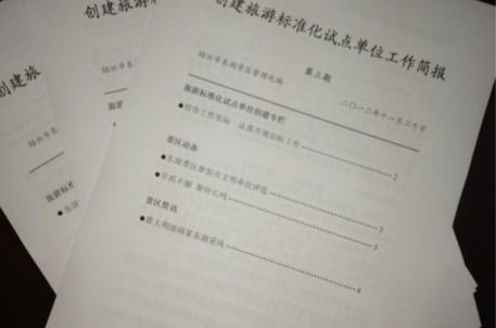 創(chuàng)標(biāo)工作簡(jiǎn)報(bào)每月二十日編版印發(fā),分設(shè)旅游標(biāo)準(zhǔn)化試點(diǎn)單位創(chuàng)建專欄、景區(qū)動(dòng)態(tài)、景區(qū)簡(jiǎn)訊、微博時(shí)訊等,具體反映了景區(qū)創(chuàng)標(biāo)工作推進(jìn)情況、創(chuàng)標(biāo)基礎(chǔ)知識(shí)及景區(qū)相關(guān)工作動(dòng)態(tài)、創(chuàng)標(biāo)成效,主要報(bào)送至市旅游集團(tuán)、紹興市旅游委員會(huì)創(chuàng)標(biāo)辦,同時(shí)通過(guò)傳閱、張貼等方式加強(qiáng)了景區(qū)各部室、員工間相關(guān)工作的交流與溝通。