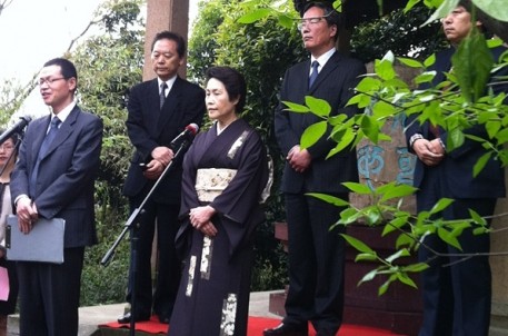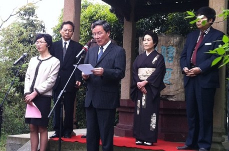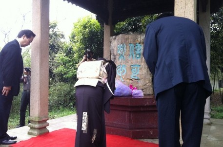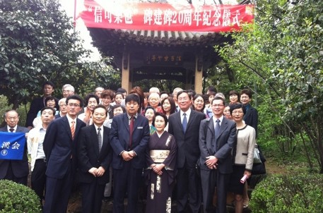 4月15日上午,日本天溪會(huì)會(huì)長(zhǎng)南鶴溪女士率40位團(tuán)員來(lái)到書(shū)法圣地蘭亭舉行“信可樂(lè)也”碑建碑20周年紀(jì)念儀式。市友協(xié)執(zhí)行副會(huì)長(zhǎng)、市外僑辦主任謝振江,省友協(xié)辦副主任吳曉東,市外僑辦副主任、市友協(xié)秘書(shū)長(zhǎng)盛伯均,蘭亭景區(qū)副主任喻革良等人參加。儀式上,喻革良先生、南鶴溪女士和盛伯鈞主任先后致辭。喻革良和南鶴溪作為“信可樂(lè)也”碑建碑二十年歷程的直接見(jiàn)證者,更是深情回憶了蘭亭和天溪會(huì)之間的友好往來(lái)及建碑歷史,雙方表示此碑已是蘭亭不可或缺的一部分,是中日友好的見(jiàn)證和橋梁,希望書(shū)法天長(zhǎng)地久,友誼天長(zhǎng)地久。最后,南鶴溪女士向“信可樂(lè)也”碑獻(xiàn)上鮮花,并深深三鞠躬?;顒?dòng)結(jié)束后,所有人員在碑亭前合影留念。