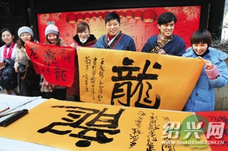 正月初一,蘭亭主區(qū)副主任、紹興知名書家喻革良攜員工和游客一起在流觴亭前潑墨揮毫,書寫“龍”字,喜迎龍年第一天。大幅照片登上了《紹興晚報(bào)》。 蘭亭景區(qū):史春霞(文) 晚報(bào)照片由記者石皎月拍攝