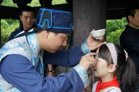 詩會同一天,沈園老管家在孤鶴軒用雄黃酒在小孩子腦門上寫“王”字。端午節(jié)用雄黃酒在小孩子腦門上寫“王”字,可以起到辟邪的作用,當然這也是寄托了大人們對孩子的希望。景區(qū)的這一活動,受到了游客的歡迎。