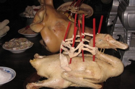 祝福總是在正廳、堂前舉行。祭品叫福禮,擺福禮要用八仙桌。祭品多數(shù)是要煮熟的,惟有魚是活的,有的還得經(jīng)過精心處理。一般的人家用“三牲”福禮,即肉一方、魚一條、鵝一只。考究一點的則加上雞和牛肉(或羊肉),這叫“五牲”福禮。最講究而表示至誠的則還有外加熊掌、羊肉的“七牲”福禮。雞、鵝要曲著身子,雙腿跪著放。在肉和雞、鵝之類的祭品上,要橫七豎八地插上一些紅筷子,數(shù)目要成單,以七、九為宜。插上十根那是萬萬使不得的,據(jù)說是因為物滿則仄,福神以為你家已稱心如意了,那就不會再賜福給你,而且弄不好還會降災(zāi)惹禍。祭品中的魚是鮮活的,整條地放在朱漆桶盤上,在眼睛上貼上一張紅紙,講究點的是用紅紙剪出的“?!弊?。