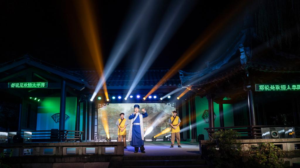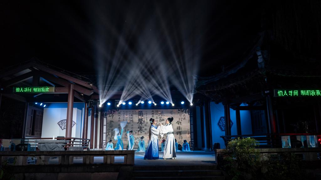 夜幕下的沈氏園清雅古典,燈光交相呼應,園林景致疏密有致,游客漫步其中如夢如幻。新版“沈園之夜”堂會演出以紹興越劇為主,穿插落花落、紹劇、平湖調等紹興本土劇種,以“游園”、“別園”、“歸園”、“題園”、“惜園”五大板塊,生動演繹沈園這個宋代名園的浪漫柔美和陸游與唐琬悲涼凄美的愛情故事。