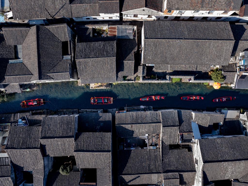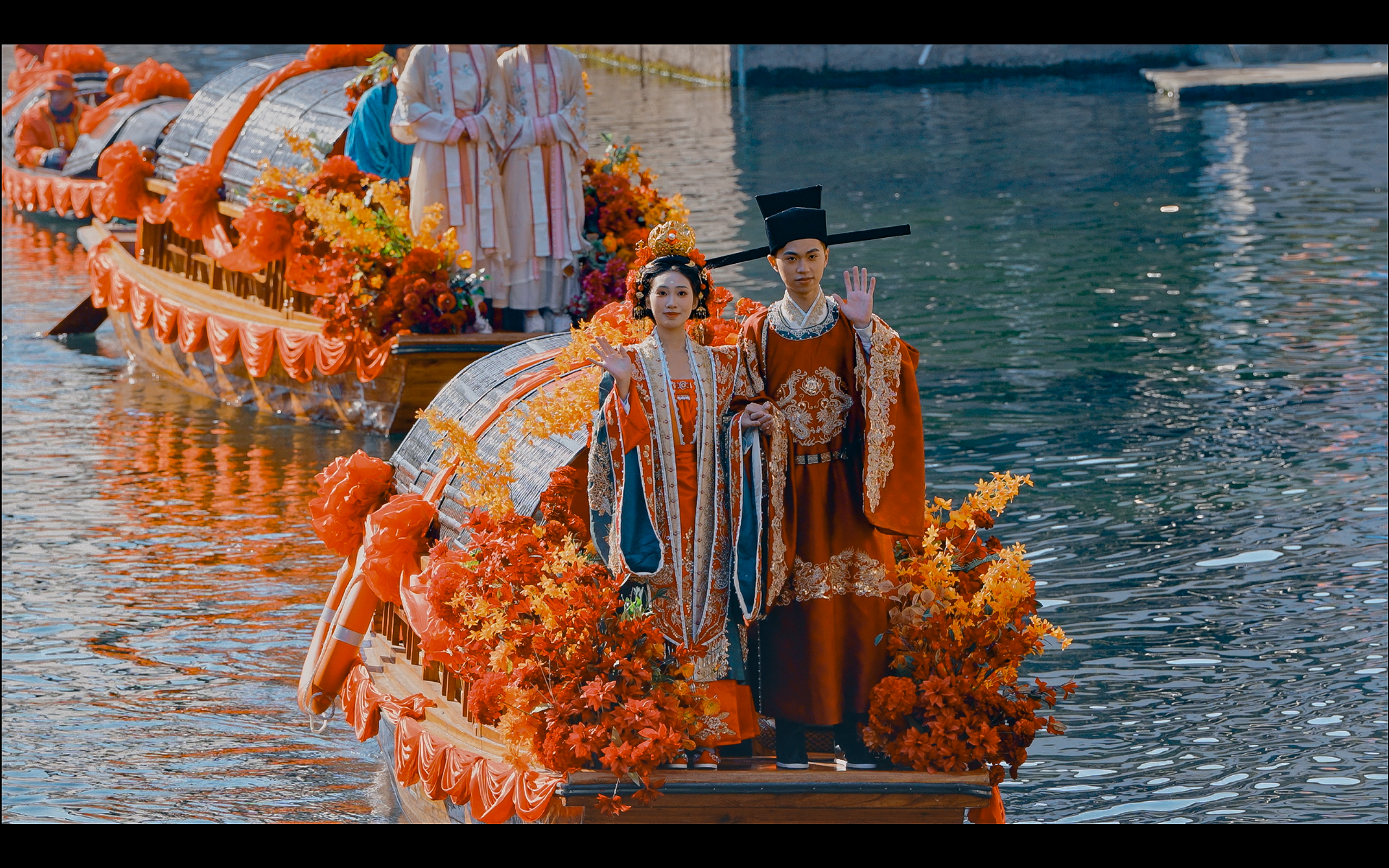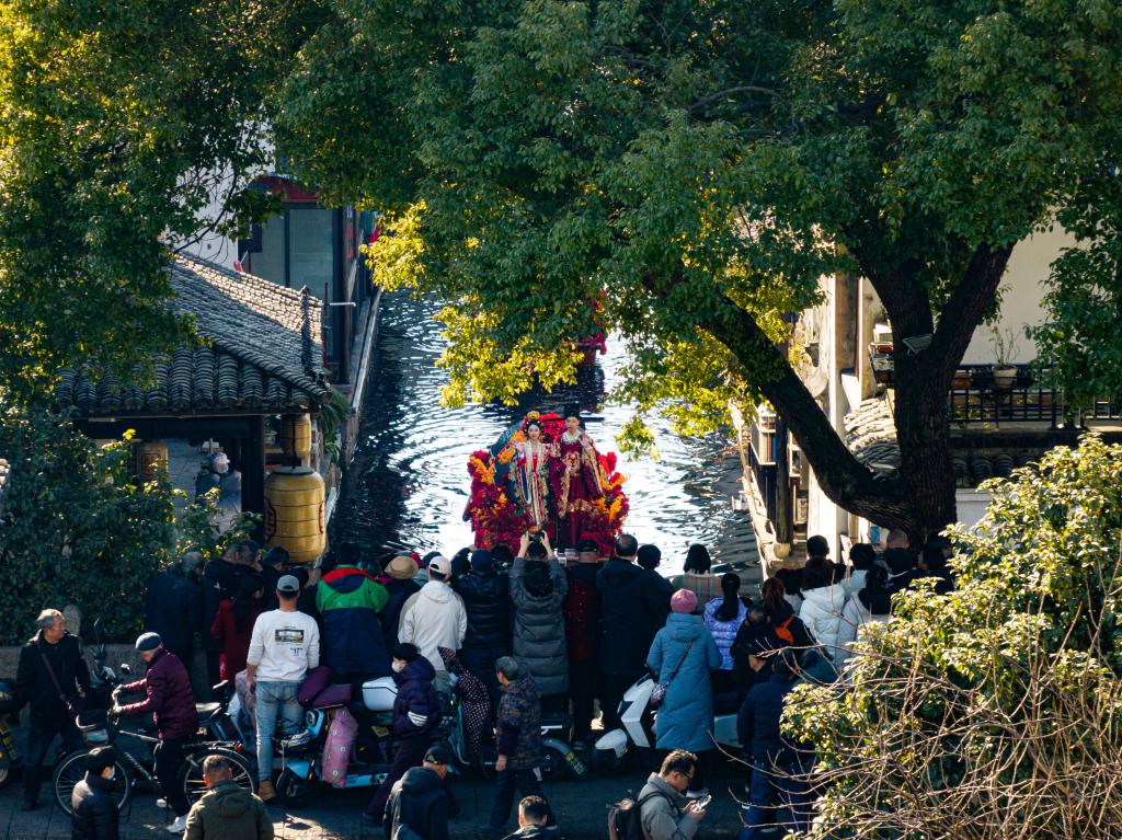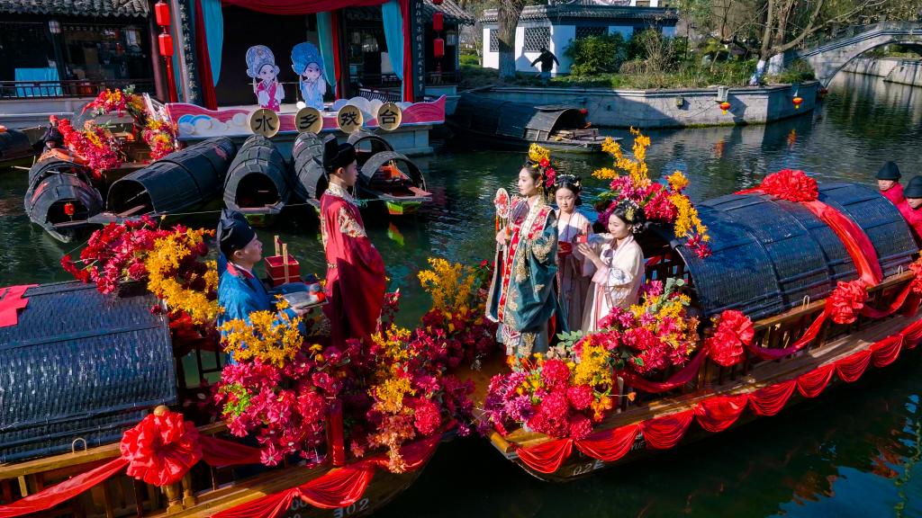在城市廣場水域,開啟一場老紹興水上迎親巡游,伴隨著熱鬧的鑼鼓、喜慶的嗩吶,新人攜手一起跨火盆、過馬鞍、挑蓋頭、拜天地、許誓言,向大家分撒喜糖。在鼓樂聲中,一對新人坐著烏篷水上巡游,將浪漫演繹到極致。圍觀群眾可以加入迎親的船隊,沾沾新人喜氣。新人在眾人的祝福中完成一場傳統(tǒng)水上婚禮,攜手開啟幸福人生。