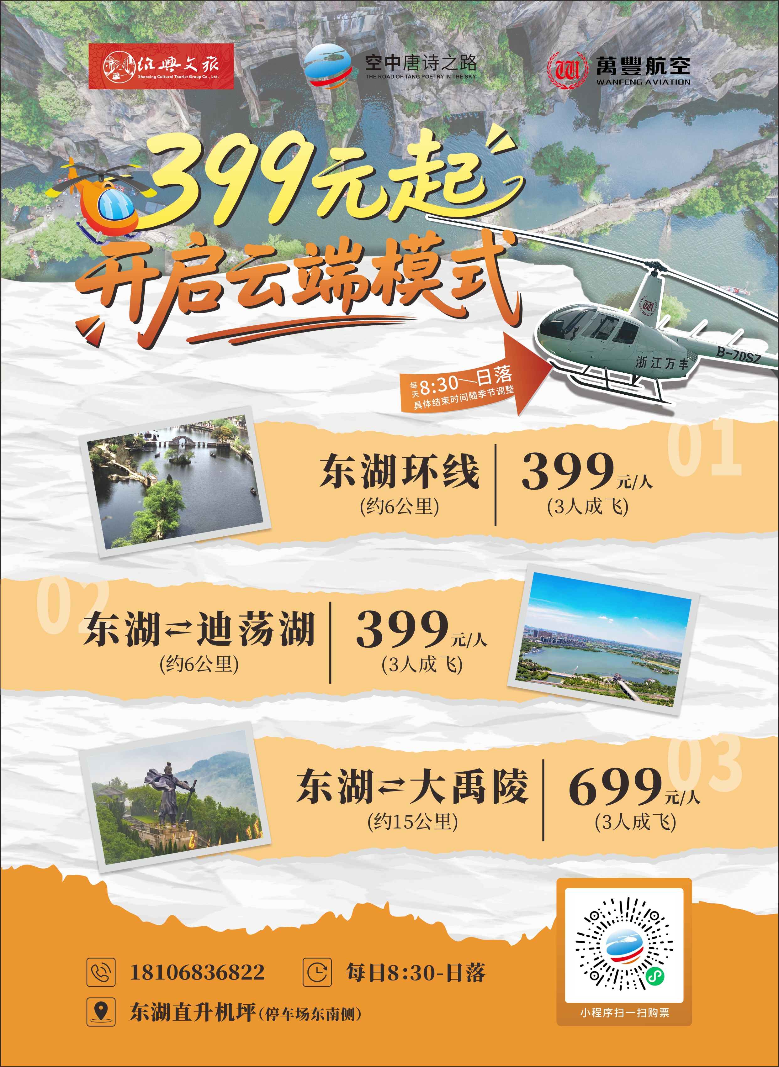 東湖景區(qū)航線,全程6公里,售價399元/人,此航線繞東湖景區(qū)外圍飛行,返程途徑陶舍、1號烏篷船碼頭,可遠看,山明水秀、風(fēng)光旖旎;近觀,巖奇洞幽、亭橋錯落,是深度體驗東湖山水風(fēng)光的絕佳航線。
