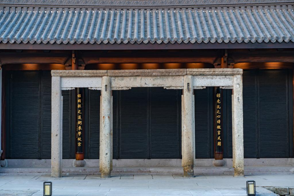 石門框是王陽明故居第一進(jìn)主體建筑,是現(xiàn)存六大考古遺跡之一。據(jù)《姚江王氏越城山陰住宅地域圖》所載,石門框原為四柱三間,現(xiàn)西側(cè)石柱為后期恢復(fù)。石柱上的楹聯(lián):“紹堯、孔之心傳,微言式闡;倡周、程之道術(shù),來學(xué)攸宗”,是隆慶帝對(duì)王陽明的學(xué)術(shù)評(píng)價(jià)《誥命》,由中國(guó)書協(xié)名譽(yù)主席蘇士澍先生所寫。石門框不僅見證著伯府昔日的規(guī)制,更彰顯了王陽明承續(xù)孔孟、光大宋儒的道統(tǒng)地位。
